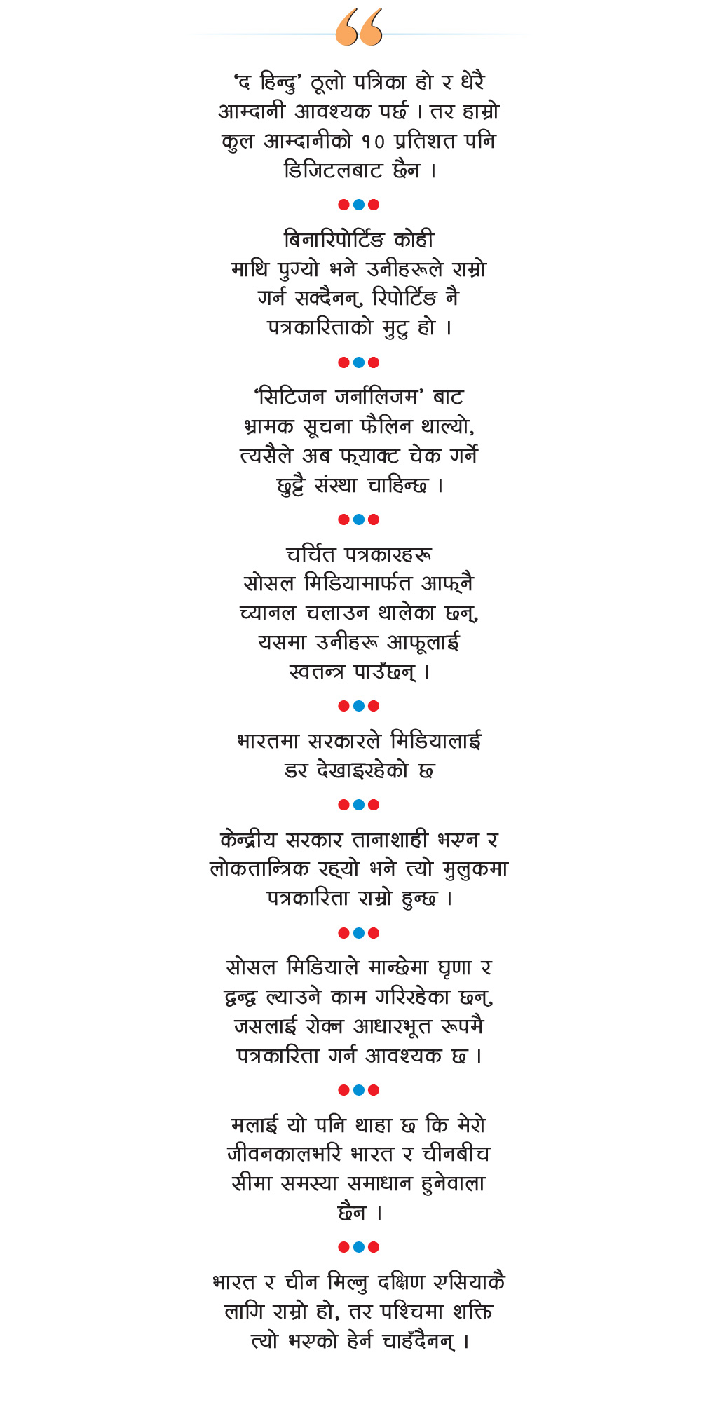 In independent journalism, I have seen the good situation of Nepal in South Asia. The condition of Nepal is much better than that of India. It can also be seen in the reports issued by various organizations. In South Asia as a whole, journalism is good in that country if the central government is not dictatorial and remains democratic. Because we have good journalists.