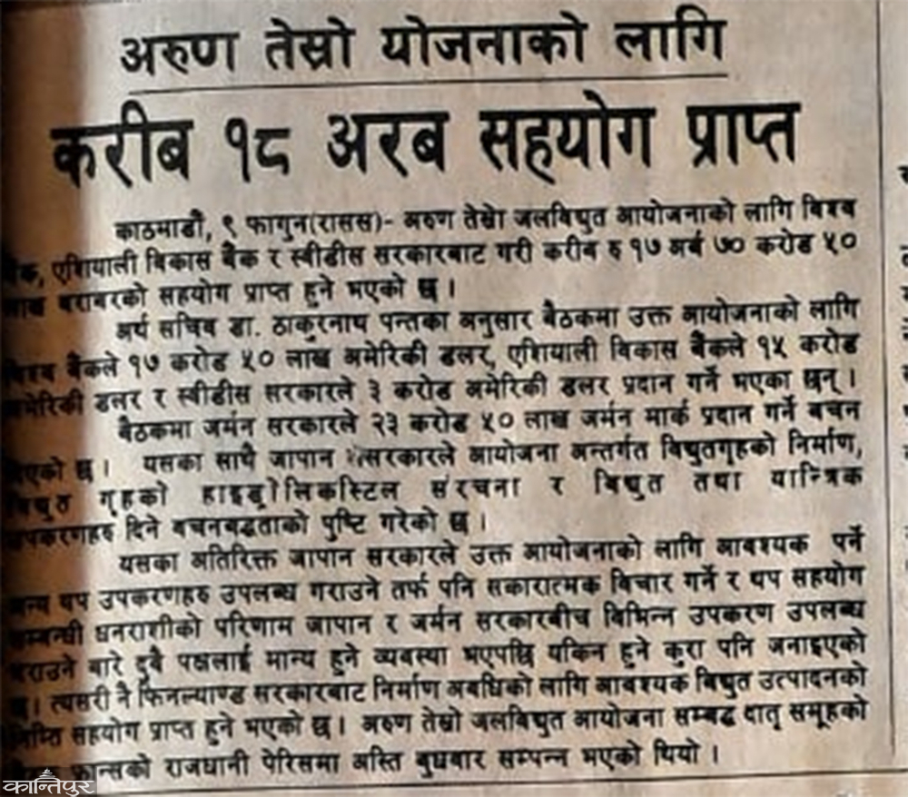 Kantipur published the news on the front page on 10 February 2048 titled 'About 18 billion support received for Arun Third Plan' prepared by the National News Committee by adding the context of raising funds for the construction of the Arun project, which was much talked about at that time and was considered ambitious.