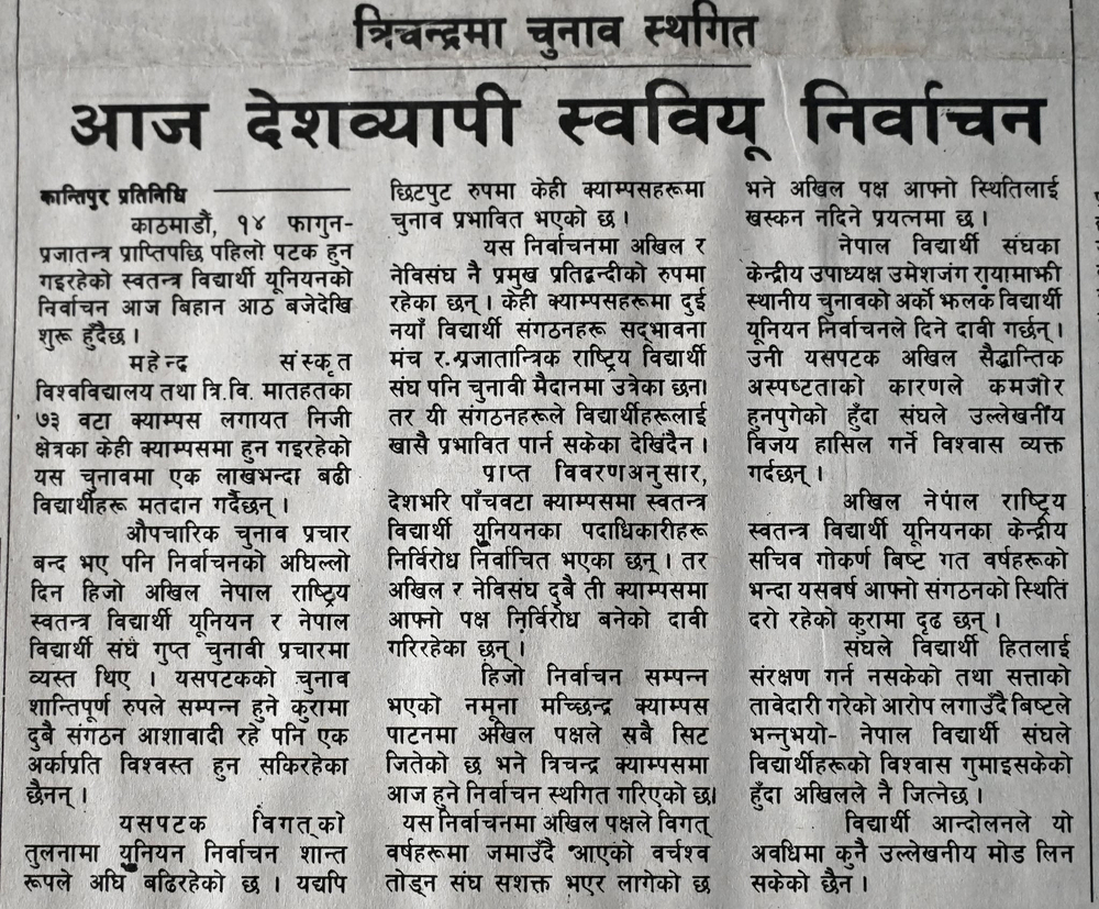 स्ववियु चुनावको विषयमा कान्तिपुरले २०४९ फागुन १५ मा प्रथम पृष्ठमा समाचार प्रकाशन गरेको थियो । यो समाचारमा त्यतिबेलाका एमालेको भ्रातृ संगठन अनेरास्ववियुका केन्द्रीय सचिव गोकर्ण विष्टको भनाइ पनि उद्धृत गरिएको छ ।