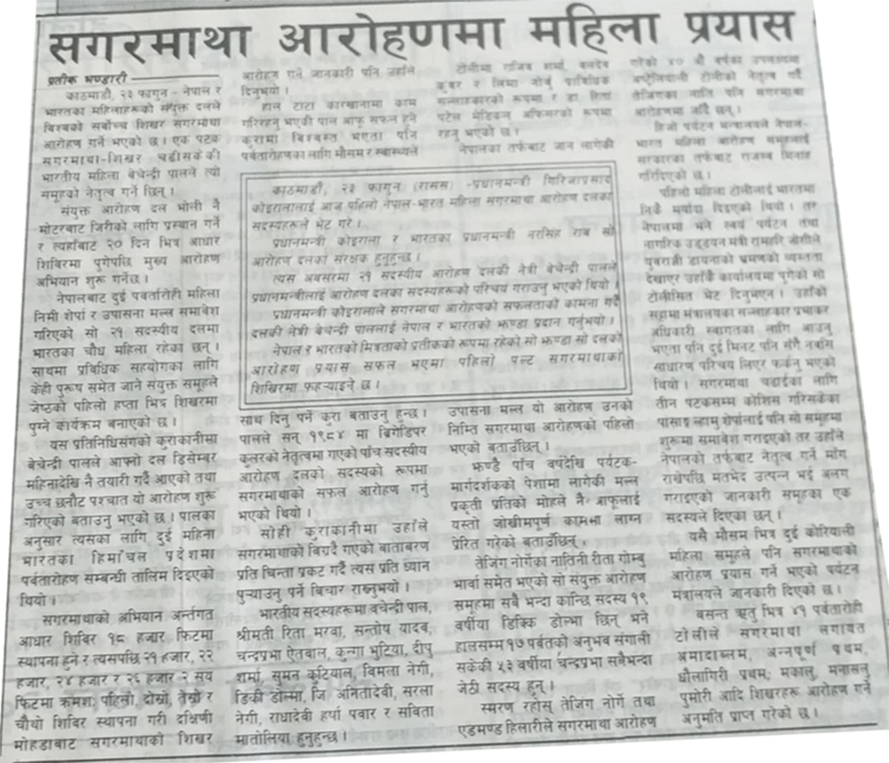 Pasang Lhamu Sherpa of Solukhumbu failed to climb Mt. Everest three times. The incident was fresh for many. In this scenario, the Indian woman climber Bechendri Pal, who had climbed Mount Everest for the first time in 1984, came to Nepal preparing to climb Mount Everest for the second time. Nepal's Nima Sherpa and Upasana Malla were also included in the 21-member climbing team led by Bechendri Pal.