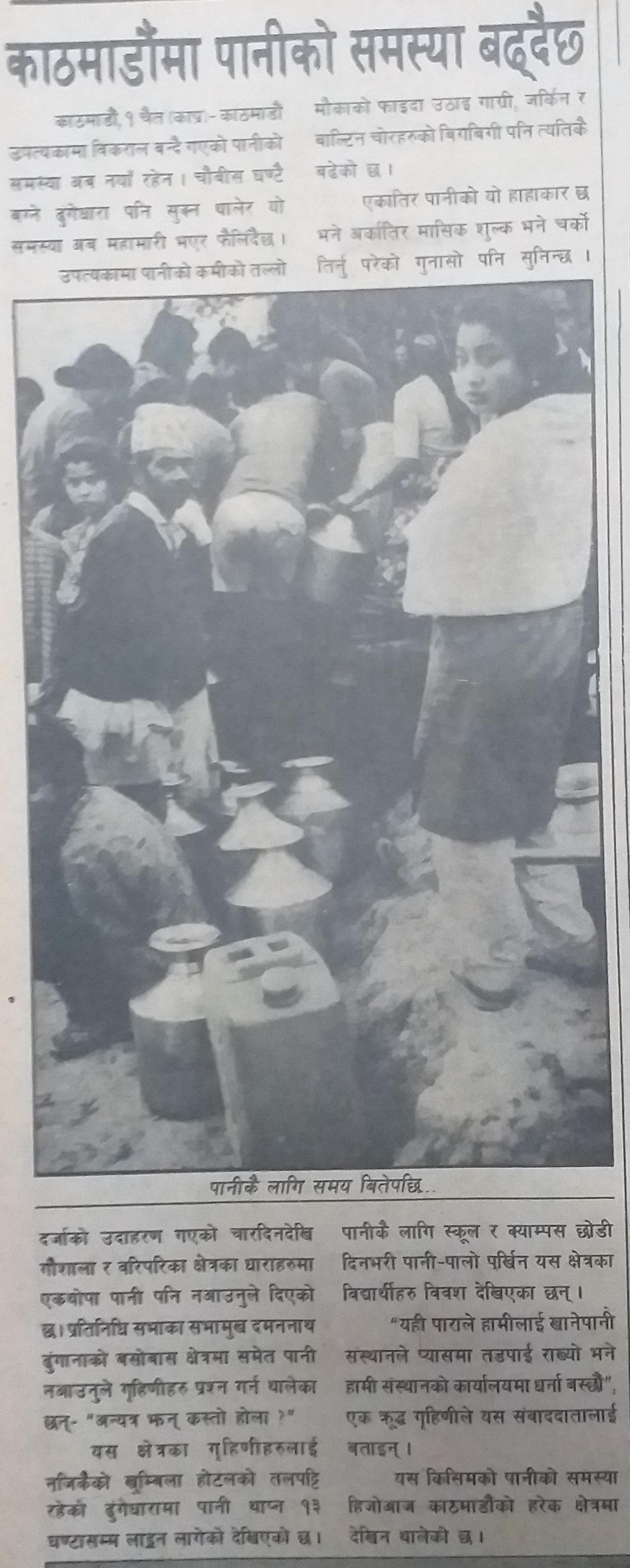 ३२ वर्षअघि अर्थात् २०४९ चैत २ मा कान्तिपुरमा छापिएको समाचार त्यतिबेलाको काकाकुल बुझाउन काफी छ । यो समाचारमा काठमाडौं उपत्याकामा पानीको समस्या विकराल बन्दै गएको पृष्ठभूमि समेटिएको छ अनि ढुंगेधारा सुक्दै जान थालेपछि समस्या महामारी बन्ने आकलन गरिएको छ ।