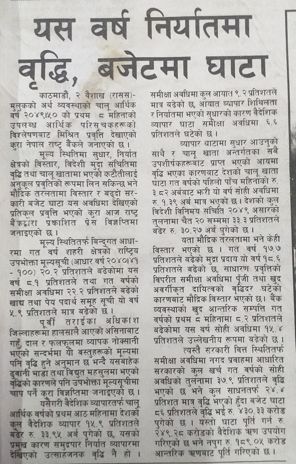 The news prepared by the National News Committee (RASS) about the economic situation of the country in the two years after the establishment of democracy in the country was published in the issue of Kantipur on May 3, 2050 under the title 'Increase in exports this year, deficit in the budget'.