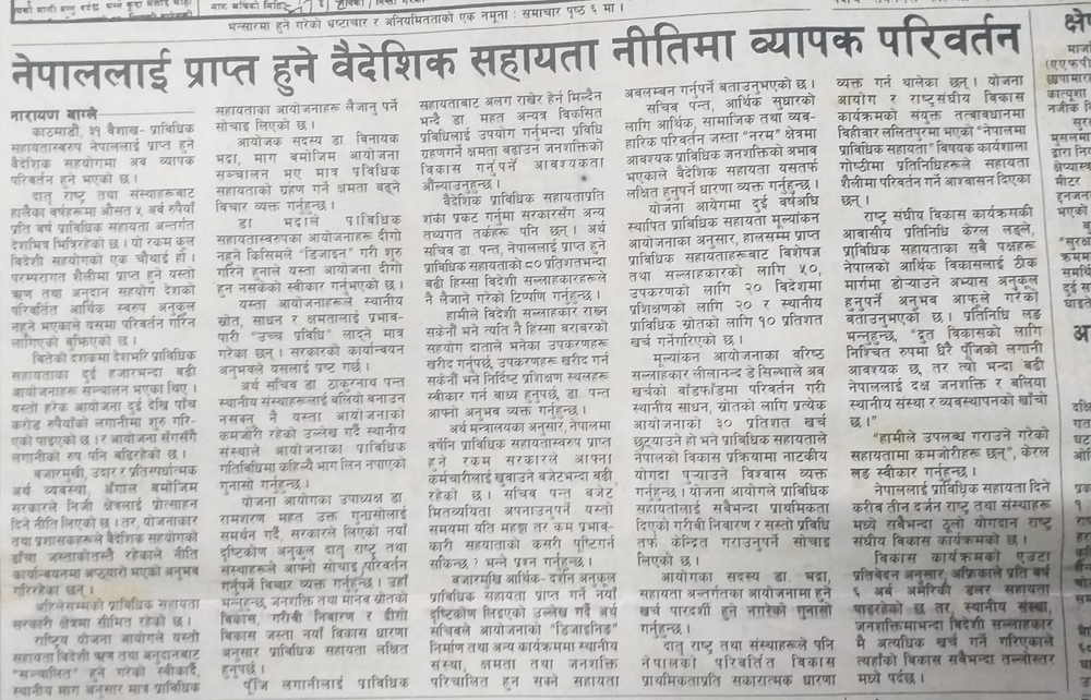 He believed that the development of Nepal requires skilled manpower and strong local institutions. The news prepared by journalist Narayan Wagle was published on the front page of Kantipur Dainik on 1st May 2050, focusing on the issues of utilization of foreign technical assistance, modality and timely changes.