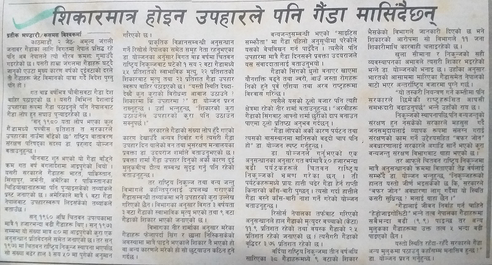 The news prepared by journalist Narayan Wagle was published by Kantipur Dainik on 3rd Baisakh, 2050, raising questions about the decreasing number of rhinos due to unsafe habitats, poaching, and gifts.