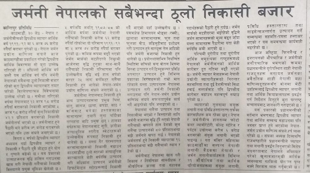 ५० को दशकमा नेपाल र जर्मनीबीच फोटो कलर ल्याबोरेटोरी, कोल्डस्टोरेज र पर्यटन उद्योगमा करिब ६ करोडको संयुक्त लगानी भएको थियो । सरकारको खुला अर्थनीति र गलैंचा उत्पादनले निकासी व्यापारमा पुर्याएको योगदान र जर्मनीमा हुने गरेको गलैंचा व्यापारका विषय समेटेर तयार गरेको समाचार कान्तिपुर दैनिकले २०५० जेठ ३१ मा प्रकाशन गरेको थियो ।