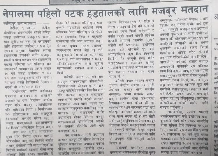 प्रजातन्त्र प्राप्तिपछि मजदुरले पाएको अधिकार र हडतालका लागि गरिएको मतदानका विषयलाई समेटेर २०५० साउन २ गते कान्तिपुर दैनिकले ‘नेपालमा पहिलो पटक हडतालको लागि मजदुर मतदान’ शीर्षकमा भित्री पेजमा समाचार प्रकाशन गरेको थियो ।