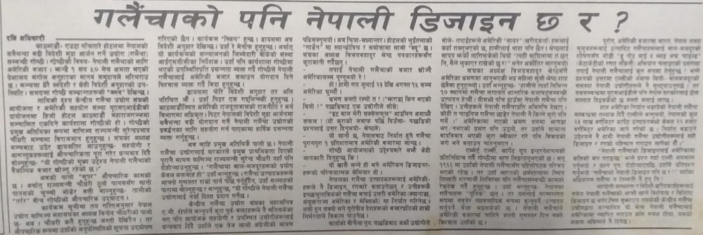 About the carpet industry that is enthusiastically earning foreign exchange by exporting Nepal's products and its market expansion, the news titled 'Carpets also have Nepali design?' was published on the front page of Kantipur Dainik on August 20, 2050.