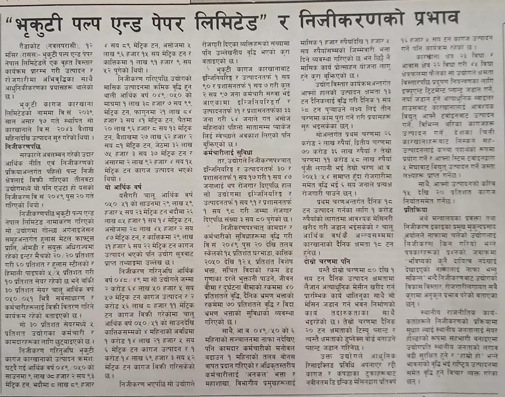 The allegation of selling the Bhrikuti paper factory run by the government in the name of privatization is still a topic of political discourse. Even though the factory is now closed, it seems natural to criticize the privatization and its consequences. But the statistics show that in the early days of privatization, the production of the industry increased and became profitable.