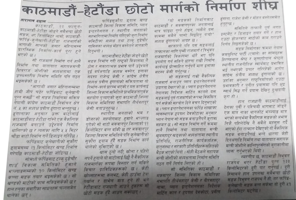 Regarding the readiness shown by the government, local representatives and common people regarding the construction of a short distance road connecting the Terai, the news prepared by journalist Taranath Dahal was published by Kantipur Daily on 23 February 2050 under the title "Kathmandu-Hetaunda short road construction speedy". The road, which has been under construction since then, has not been fixed even now. However, especially small vehicles are operating through Kathmandu-Hetounda.