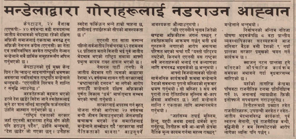 आग्रह र पूर्वाग्रहबिनाको राजनीति कसरी गर्न सकिन्छ ? उनी कसरी सबैको आदर्श बने ? उनको विचारले दिने सन्देश के हो ? यिनै सन्दर्भसहित मण्डेलाले प्रजातन्त्रका लागि गरेको संघर्ष र शासन गर्ने शैलीका विषयमा केन्द्रित रहेर कान्तिपुरले २०५१ वैशाख २५ मा ‘मण्डेलाद्वारा गोराहरूलाई आह्वान’ शीर्षकमा समाचार प्रकाशित गरेको थियो ।