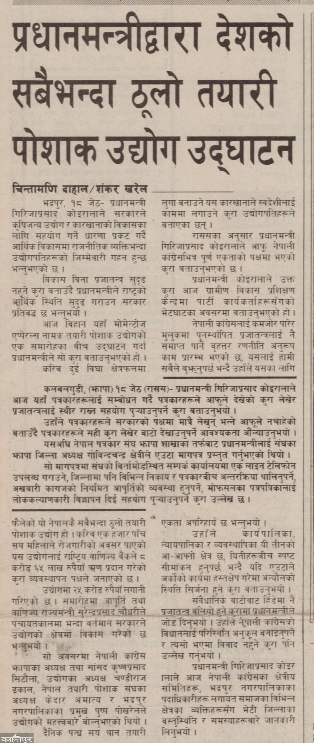 The news prepared by Chintamani Dahal and Shankar Kharel from Jhapa was published by Kantipur Dainik on 19th May, 2051 under the title 'Inauguration of the country's largest readymade garment industry by the Prime Minister', focusing on the issues of the establishment of the largest garment factory in Nepal, the jobs created by it and the investment environment.