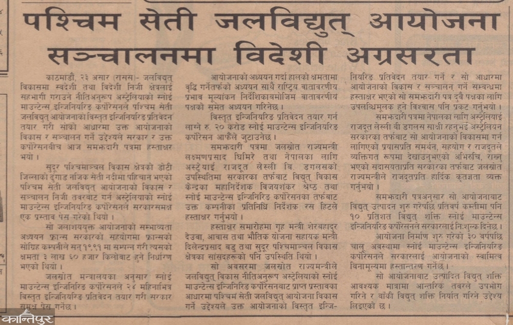 काठमाडौँ — पश्चिम सेती जलविद्युत् आयोजनाको विस्तृत इन्जिनियरिङ प्रतिवेदन तयार गरी विकास र सञ्चालन गर्ने उद्देश्यले निर्माणको जिम्मेवारी अस्ट्रेलियाको स्नो माउन्टेन्स इन्जिनियरिङ कर्पोरेसन (स्मेक)लाई दिने सम्झौता २०५१ असार २३ मा भएको थियो । सरकार र माउन्टेन्ट कम्पनीबीच सम्झौता हुँदा तत्कालीन गृहमन्त्री शेरबहादुर देउवा र आवास तथा भौतिक योजना सहायक मन्त्री दिलेन्द्रप्रसाद बडुको उपस्थिति थियो ।