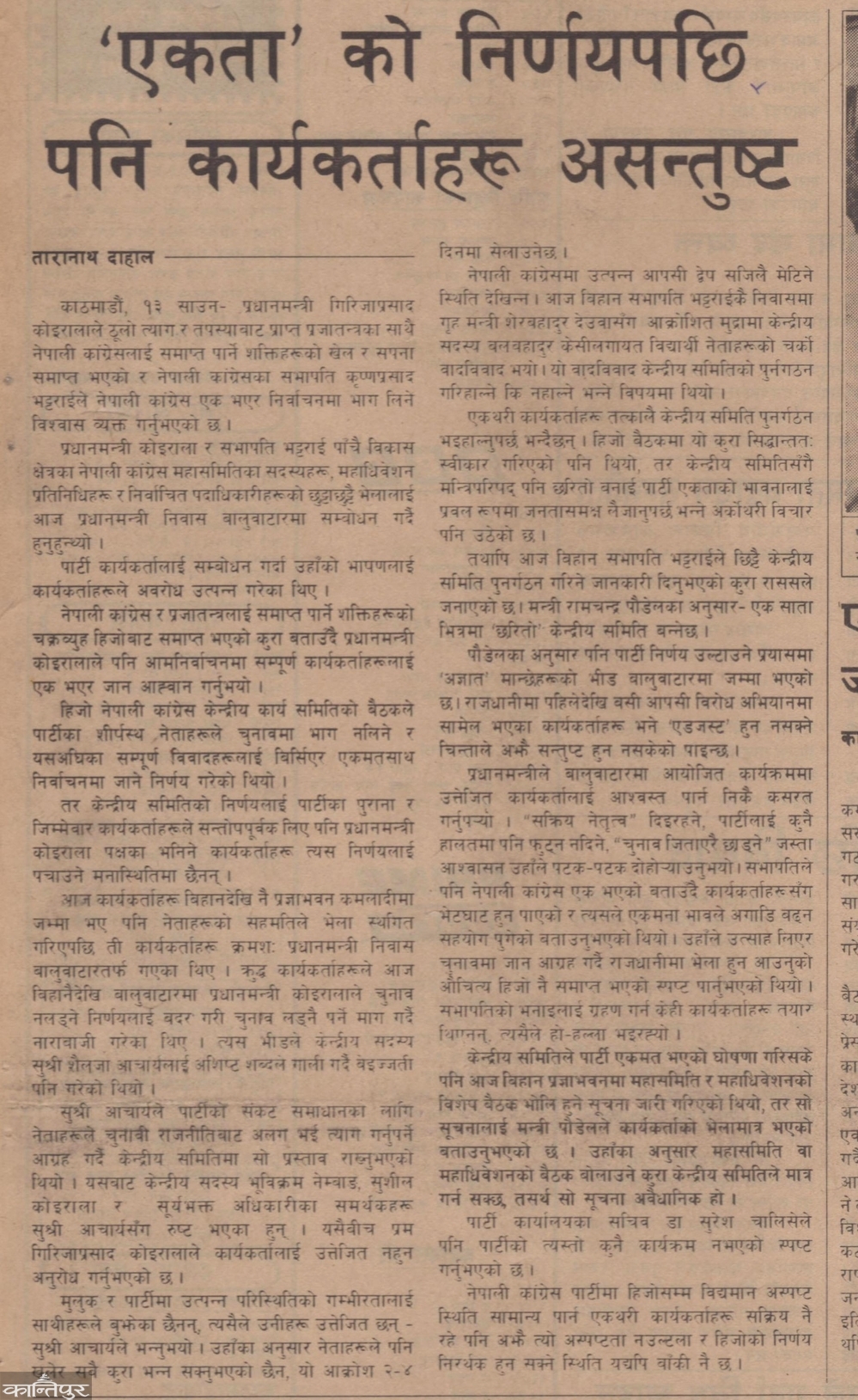 After the decision, Bhattarai said that there was no justification for the workers' meeting. Minister Ramachandra said that only the Central Committee can call the meeting of the General Assembly and General Committee members. Congress Central Office Secretary Dr. Suresh Chalise said that there is no program of the party. The news prepared by the journalist Taranath Dahal by adding the mentioned references was published in Kantipur on July 14, 2051 under the title 'Even after the decision of unity, workers are still dissatisfied'.