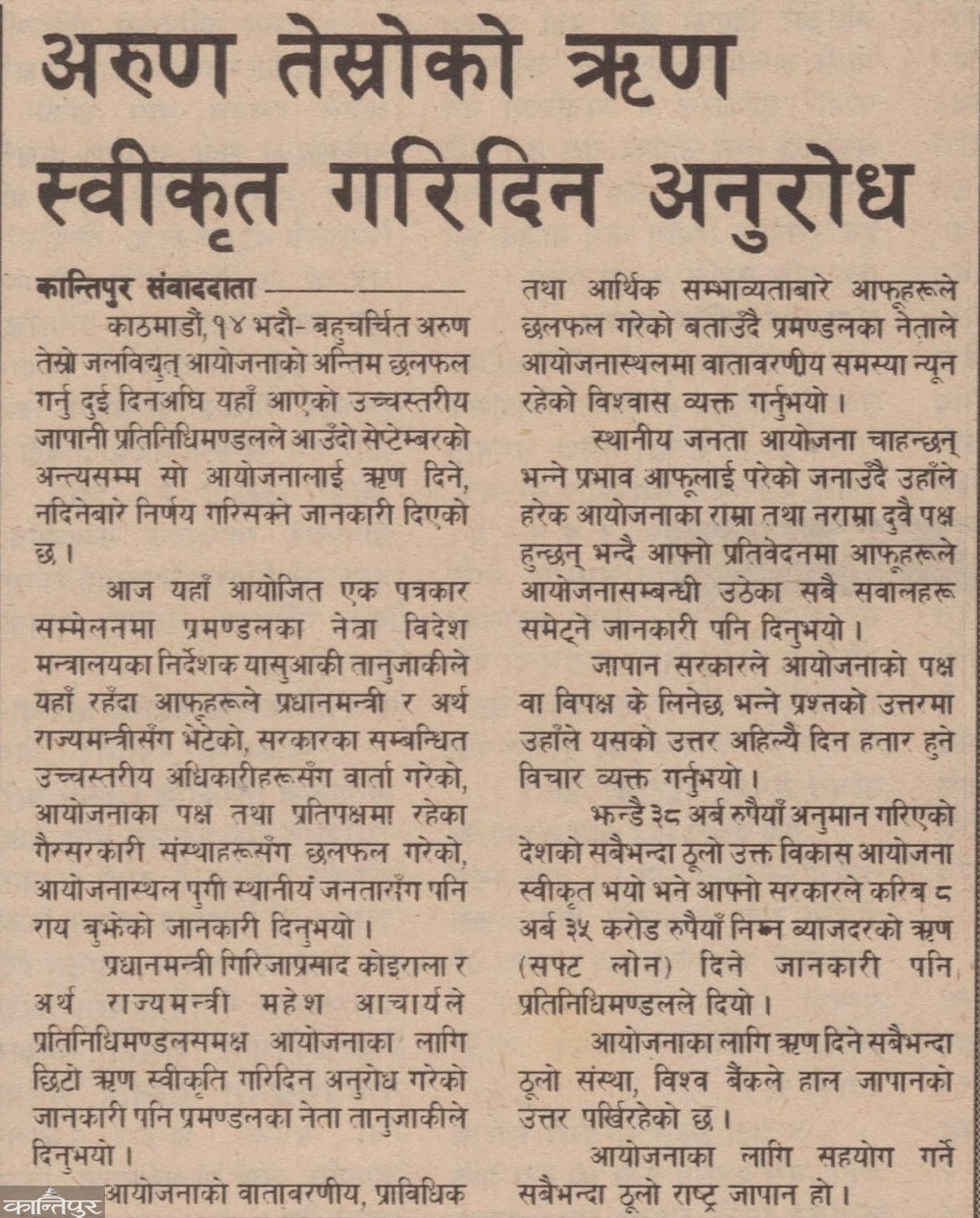 The opponents of Arun were saying that the World Bank decided not to give loans for the time being because Prime Minister Girija Prasad Koirala dissolved the parliament and ran the government. ![[Archive] After coming to Nepal, Arun's lender was the Japanese officer...](https://assets-cdn.kantipurdaily.com/uploads/source/news/kantipur/2025/miscellaneous/page1kpr-0692025010949-1000x0.jpg)