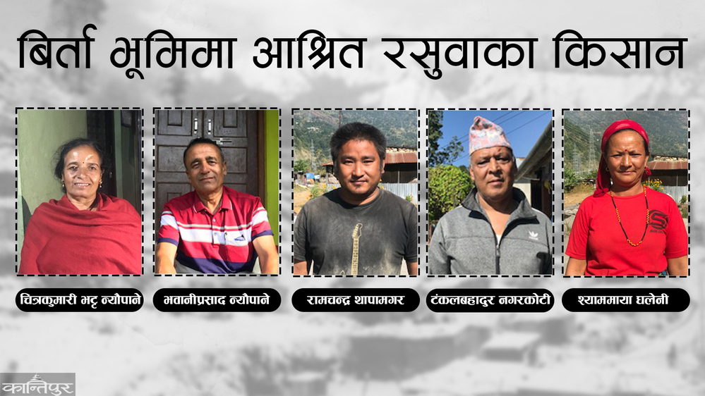 कालिका गाउँपालिका–३ कटुन्जेका भवानीप्रसाद न्यौपाने (६५) जिल्ला भूमि अधिकार मञ्च, रसुवाका अध्यक्ष हुन् । उनलाई याद भएसम्म २०३६ सालमा सरकारी मान्छे जग्गा नापी गर्न आएका थिए । तर, उनका पिता–पुर्खाको जग्गा नापी भएन । उनले कारण थाहा पाए– बुबाहरूले बिर्तावालालाई तिरो नतिरेकै कारण त्यो जग्गा नापी नभएको रहेछ । उनको घरबाट मात्रै वर्षको ५ मुरी धान कुतका रूपमा तिर्नुपर्ने रहेछ ।