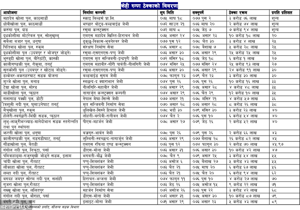 report, it is mentioned that the construction was delayed due to lack of work from the businessmen. It has been 6 years since the motorable bridge contract was awarded at Dudhkoshi at Diplighat in Solukhumbu. That is, according to the contract signed on June 24, 2075, its construction should be completed on June 23, 2078. But as mentioned in the report, the progress is only 20 percent . MS Mahadev Khimti-Hirachan JV has taken the contract for 10 crore 18 lakh rupees . Similarly, the contract for the construction of Mahadev Khola bridge on Miteri Marg in Kageshwari Manohara Municipality-3 and Kathmandu Metropolitan Municipality-4 has not been completed.