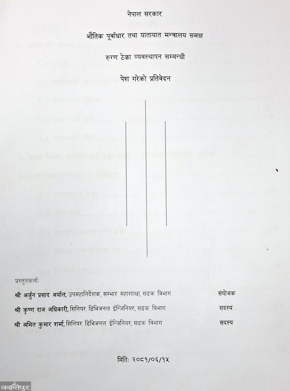It is mentioned in the report that the construction work has been affected due to delays in the decision to be made during the execution of the contract by the government agencies . Aryal-led committee took more than one and a half months to prepare the report. Senior Divisional Engineer Krishnaraj Adhikari and Amit Kumar Sharma were members of the committee along with Aryal. Although the team submitted a report to the Ministry of Physical Infrastructure and Transport last October, its implementation is just beginning. Sushil Babu Dhakal, Joint Secretary of the Ministry of Physical Infrastructure and Transport said that the report has been submitted and sent to the concerned department. "The biggest challenge is the management of sick contracts," he said, "in some cases, projects have become sick due to the budget."