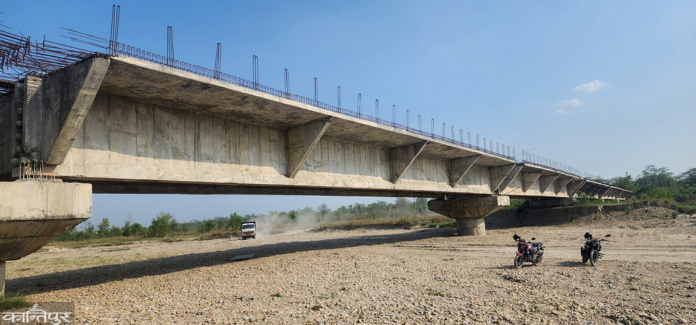 report, the number of large projects under foreign resources is 26. The contracts from 2072 have not been completed yet. An example of that is the Bangari Nadi Bridge in Bara. The contract for this bridge was made on June 29, 2071. According to the initial contract agreement, its work should be completed on June 23, 2073. As mentioned in the progress report, the progress of the contract taken by 'Elite-Mona JV' for 5 crore 43 lakhs is 89 percent . Which is progress up to the end of last June . In the
