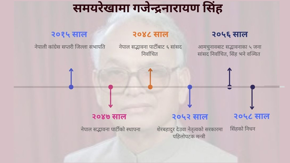 Journalist Basant Basnet has written in his book 'Awe of 72' - Singh from Saptari Koiladi was the Saptari district president of Nepali Congress in the general election of 2015. Gajendra Narayan was also one of those who campaigned for a democratic multi-party system with the Congress in the 2036 referendum. Singh is a person who has emerged creating a different image among the leaders who have reached the leadership level from the Madhsi community. After the change of 2046, he organized and institutionalized the political demands of Madhesh.