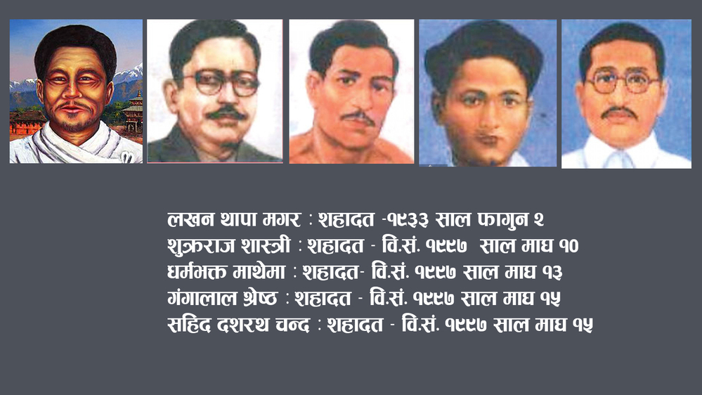 निरंकुश जहानियाँ राणा शासनविरुद्ध लागेकै कारणले लखन थापा मगर, शुक्रराज शास्त्री, धर्मभक्त माथेमा, गंगालालश्रेष्ठ र दशरथ चन्द सहिद भए ।