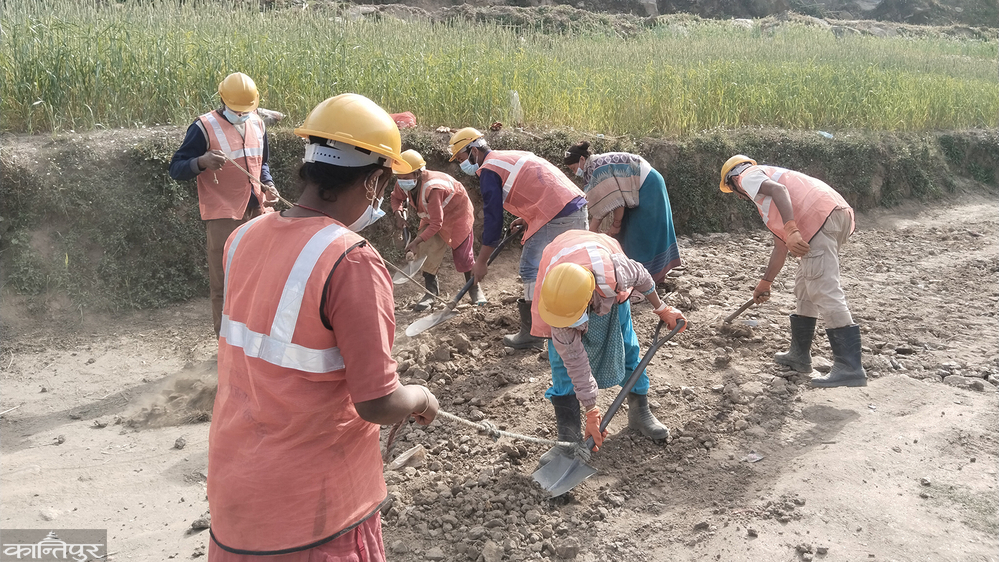 कालीकोटको नरहरिनाथ गाउँपालिका—९ लालुमा रोजगार कार्यक्रमअन्तर्गत बाटो मर्मत गर्दै स्थानीय । तस्बिर : कृष्णप्रसाद गौतम/कान्तिपुर