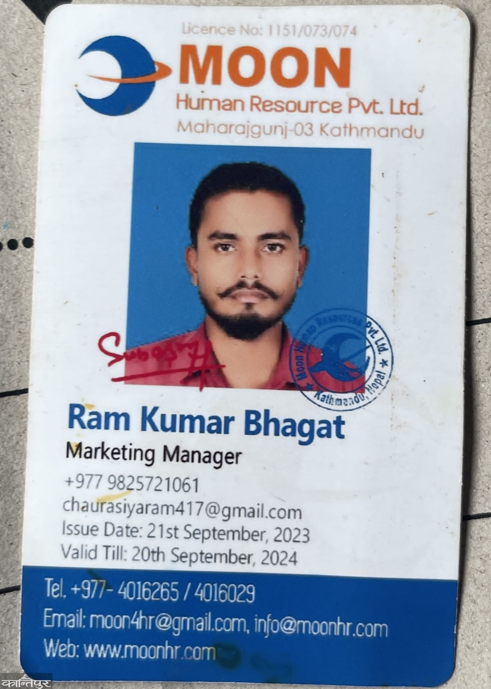 Ramkumar Bhagat's ID card is the marketing manager at 'Moon Human Resources Pvt. Ltd.'.