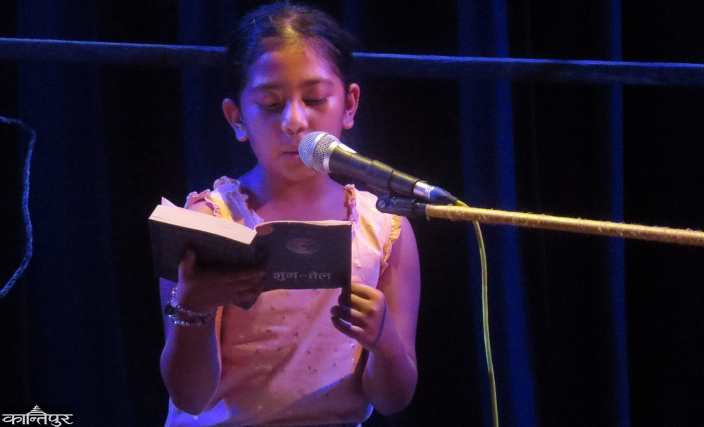 कक्षा ३ मा पढ्ने सुभान्सी बस्नेत थापाले लेखक डा. जीवन क्षेत्रीको चर्चित पुस्तक ‘नुन तेल’ मा रहेको रुख सम्बन्धी एउटा कविता पढेर सुनाएपछि नारायणी कलामन्दिरको प्रेक्षालयमा चितवनका पाका कवि पोषराज पौडेल ‘आमा’ शीर्षकको कविता सुनाउन पुगे । त्यसपछि यो सिलसिलालाई विनिता गुरुङले अलि फरक तरिकाले जोडिन् । गुरुङले ‘अब म जानु नै पर्दछ’ शीर्षकको कविता सुनाउँमा बाँसुरीको धुन पनि गुञ्जियो ।