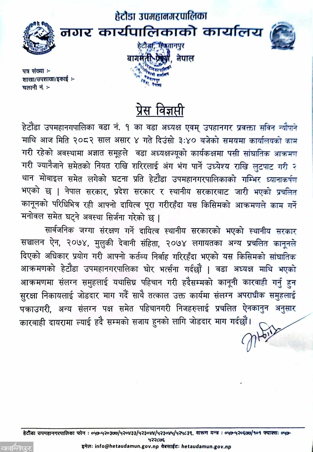 उपमहानगरपालिकाले बुधबार अपराह्न जारी गरेको प्रेस विज्ञप्तिमा वडाध्यक्ष आफ्नो कार्यकक्षमा बसेर काम गरिरहेको अवस्थामा अपरिचित व्यक्तिहरु आएर ज्यानै लिने उद्देश्यले आक्रमण गरेको ठहर गर्दै आक्रमण संलग्न व्यक्तिहरुलाई तत्काल नियन्त्रणमा लिएर कानुनी कारबाही गर्न माग गरिएको छ । हेटौंडा उपमहानगरपालिका–१ वडाध्यक्ष तथा उपमहानगरका प्रवक्ता न्यौपानेमाथि बुधबार दिउँसो अज्ञात समूहले सांघातिक आक्रमण गरेको थियो ।