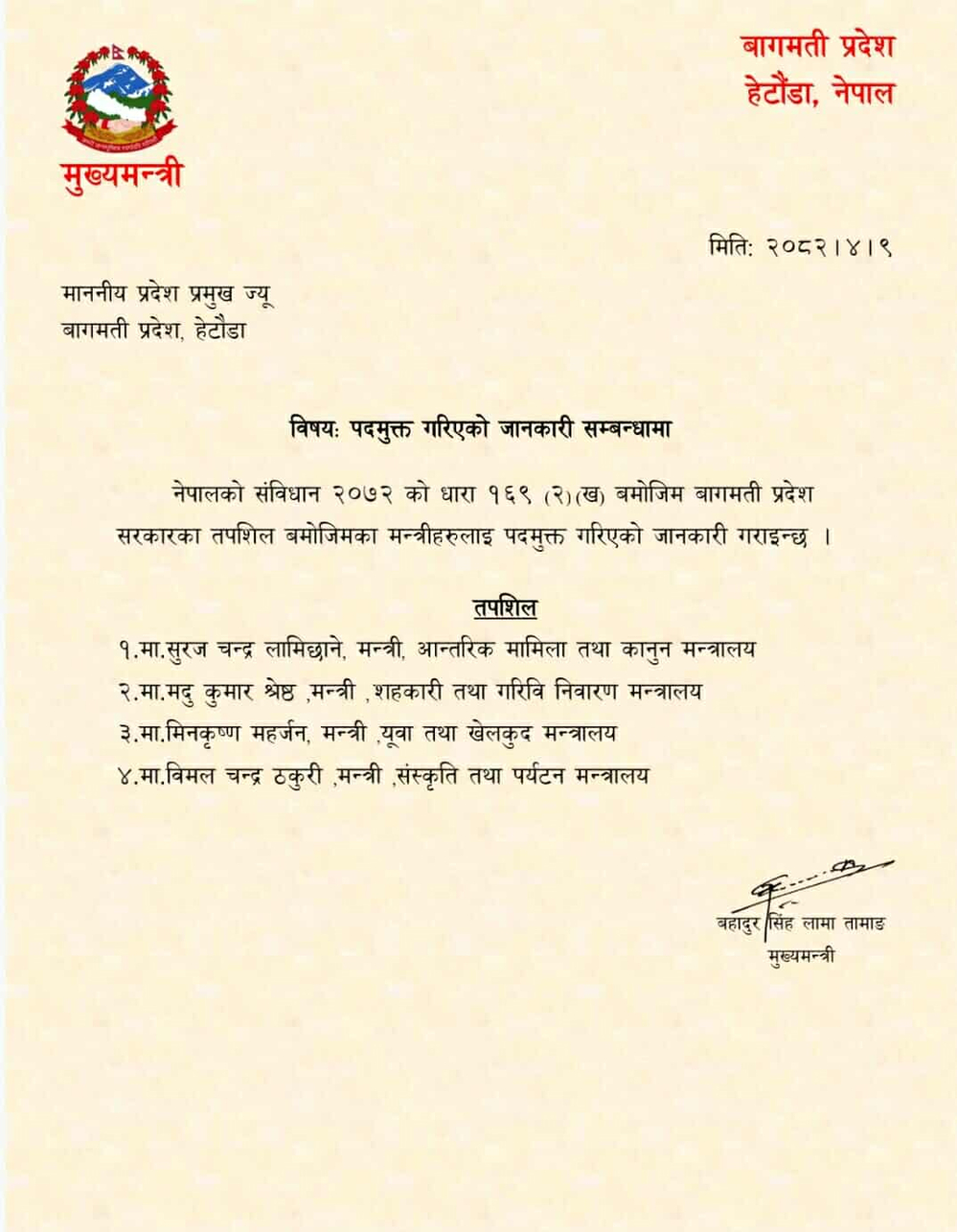 लामाले नेपालको संविधान २०७२ को धारा १६९ (२) (ख) अनुसार चार मन्त्रीलाई पदमुक्त गरेका हुन् । बागमती प्रदेश सरकारका आन्तरिक मामिला तथा कानुनमन्त्री सुरजचन्द्र लामिछाने, युवा तथा खेलकुदमन्त्री मिनकृष्ण महर्जन, संस्कृति तथा पर्यटनमन्त्री बिमल ठकुरी र सहकारी तथा गरिबी निवारणमन्त्री मदुकुमार श्रेष्ठले शुक्रबार दिउँसो राजीनामा दिएका थिए ।