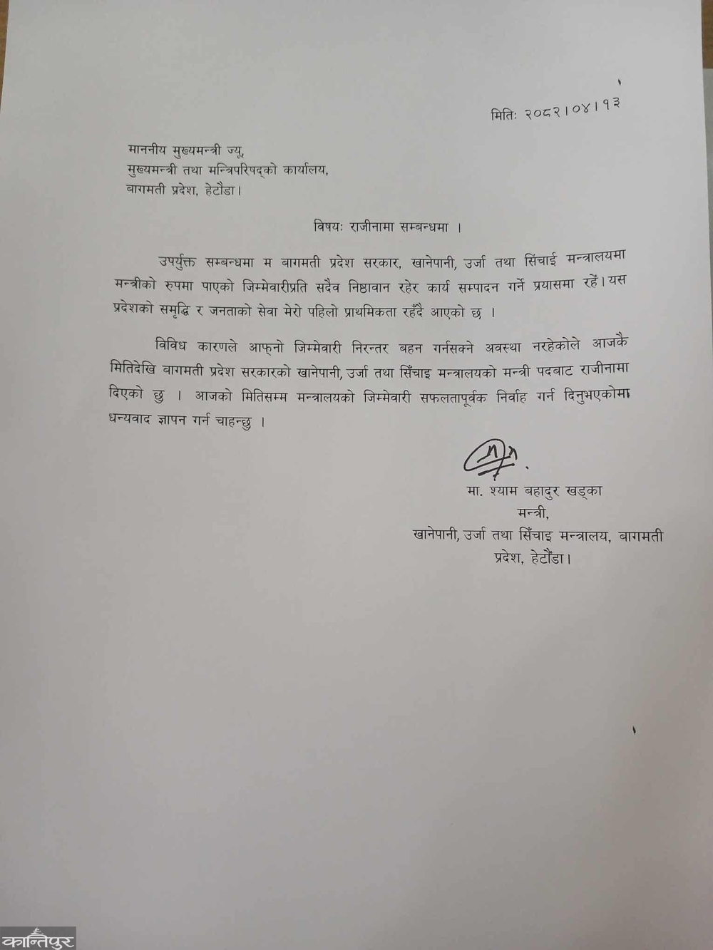 काठमाडौँ — बागमती प्रदेशको खानेपानी, ऊर्जा तथा सिँचाईमन्त्री श्यामबहादुर खड्काले सोमबार दिएका छन् । उनले मुख्यमन्त्री बहादुरसिंह लामालाई आजैको मितिदेखि लागू हुनेगरी राजीनामा बुझाएका हुन् ।