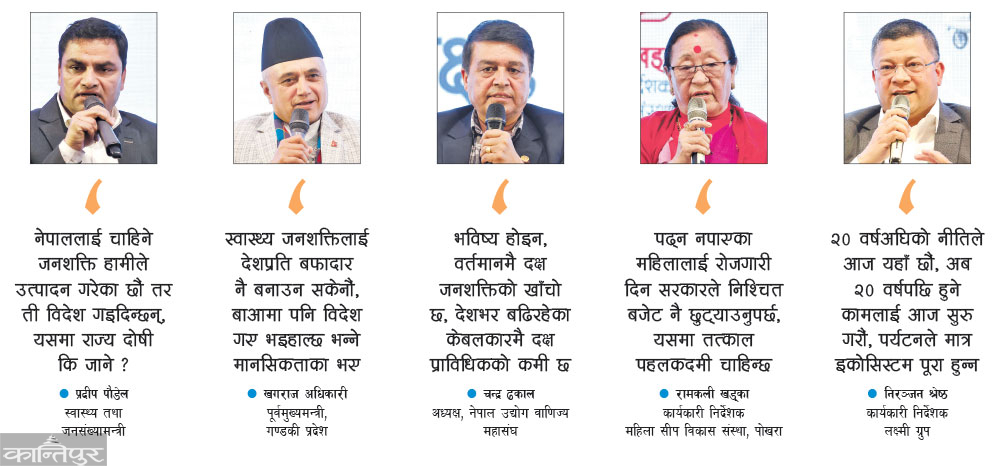 कान्तिपुर मिडिया ग्रुपले बुधबार पोखरामा आयोजना गरेको ‘गन्तव्य गण्डकी’ कार्यक्रमको तेस्रो सत्र ‘मूल सरोकार : शिक्षा, स्वास्थ्य, रोजगार’ मा नेपाल उद्योग वाणिज्य महासंघका अध्यक्ष चन्द्र ढकालले भविष्य होइन, वर्तमानमै दक्ष जनशक्तिको खाँचो रहेको प्रस्ट्याए । ‘केबलकार देशभर बढिरहेका छन्, त्यसमा काम गर्ने प्राविधिकको कमी छ,’ उनले भने, ‘अन्य क्षेत्रमा पनि प्राविधिक जनशक्तिको अभाव टड्कारो छ ।’