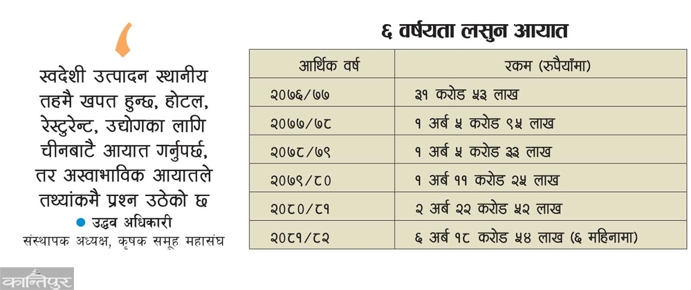 ‘स्वदेशी उत्पादन स्थानीय तहमै खपत हुन्छ, होटल, रेस्टुरेन्ट, उद्योगका लागि चीनबाटै आयात गर्नुपर्छ,’ कृषक समूह महासंघका संस्थापक अध्यक्ष उद्धव अधिकारीले भने, ‘तर अस्वाभाविक आयातले तथ्यांकमै प्रश्न उठेको छ ।’ कृषि वस्तु आयातमा भन्सारमा सुविधा पाइन्छ । सुविधा पाउनकै लागि लसुन देखाएर अन्य वस्तु आयात भएको हुन सक्ने उनको दाबी छ ।