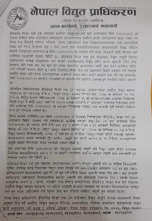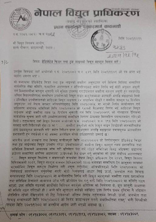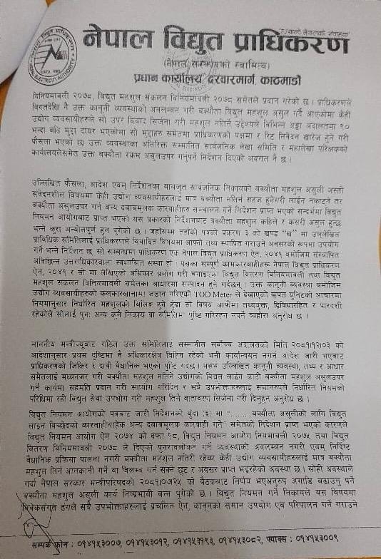 डेडिकेटेड तथा ट्रंकलाइनबाट विद्युत् उपभोग गर्ने ग्राहकको बक्यौता निर्क्योल गर्न ऊर्जा, जलस्रोत तथा सिंचाइ मन्त्रालयले गठन गरेको समितिलाई सर्वोच्च अदालतले काम गर्न रोक लगाएको र बिजुली काट्ने बाहेक अन्य उपाय अपनाउँदा समेत बक्यौता असुल नभएको भन्दै उद्योगमा बिजुली काटेर भए पनि असुल गर्ने भन्दै आयोगलाई पत्र काटेको हो ।