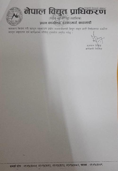 'महसुल नबुझाउने उद्योग व्यवसायीहरु विद्युत् लाइन काटि निर्बाधरुपमा बक्यौता महसुल असुल उपर गर्न मार्गप्रशस्त गरिदिनु हुन अनुरोध गर्दछु,' घिसिङले आयोलाई लेखेको पत्रमा उल्लेख छ ।