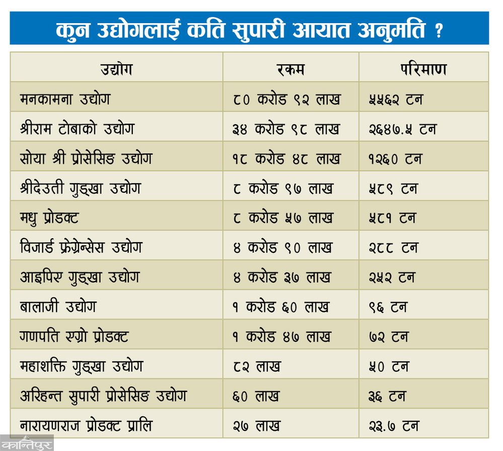 The Department of Commerce, Supply and Consumer Protection has given import permission on the recommendation of the Industry Department. Since October, 12 industrialists have received permission to import 11,457 tons of betel nuts worth 1.66 billion. The highest number of Mankamana industries has got permission to import 5 thousand 562 tons of betel nuts worth 809.2 million rupees. Manakamana has received permission to import betel nuts from Indonesia through Biratnagar customs checkpoint.
