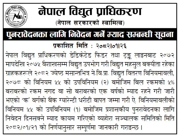 ‘डेडिकेटेड फिडर तथा ट्रक लाइनबाट २०७२ माघदेखि २०७५ वैशाखसम्म विद्युत् उपभोग गरी विद्युत् महसुल बक्यौता रहेका ग्राहकहरूले २०८२ जेठमसान्तभित्र प्राधिकरणको विद्युत वितरण विनियमावली, २०७८ को विनियम ५५ को उपविनियम (२) बमोजिम बिल रकमको ५ प्रतिशत बराबरको रकम नगद वा सो बराबरको एक वर्षको म्याद रहने गरी जारी भएको ‘क’ वर्गको बैंक ग्यारेन्टी धरौटी बापत जम्मा गरी ऐन विनियमावलीको विनियम ५५ को उपविनियम (१) बमोजिम प्रशासकीय पुनरावेदनका लागि निवेदन दिनसक्ने म्याद कायम गरिएको,’ प्राधिकरणद्वारा जारी सूचनामा उल्लेख छ ।