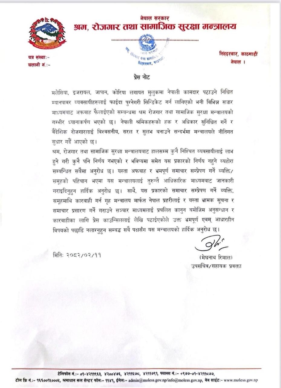 मलेसिया, इजरायल, जापान, कोरियालगायत मुलुकमा नेपाली कामदार पठाउने निश्चित म्यानपावर व्यवसायीहरुलाई फाइदा पुग्नेगरी सिन्डिकेट गर्न लागिएको भनी विभिन्न सञ्चारमाध्यमबाट अफवाह फैलाइएकोप्रति श्रम मन्त्रालयको गम्भीर ध्यानाकर्षण जनाएको हो । श्रम मन्त्रालयले ‘भ्रमपूर्ण एवम् आधारहीन विषयको पछाडि नलाग्नुहुन सम्बद्ध सबै पक्ष सरोकार पक्षलाई अनुरोध’ गरेको छ ।