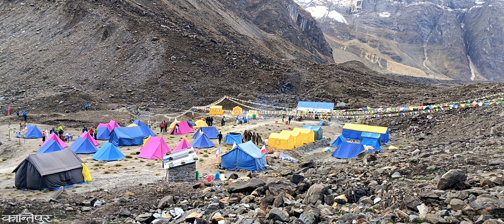 The tourist tents and tea houses placed next to the Panchkund Himal at the foot of the Annapurna First Himal. Photo: Ghanshyam Khadka/Kantipur