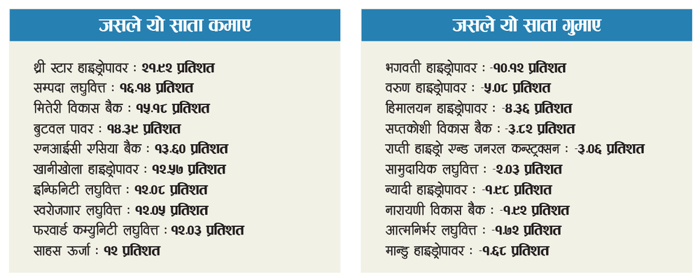 This week, the share price of Three Star Hydropower increased by 21.92%, Sampada Lagufitta 16.14%, Miteri Bikas Bank 15.18% and Butwal Power by 14.39%. NIC Asia Bank 13.60, Khanikhola Hydropower 12.57, Infinity Lagufitta 12.08, Swarojgar Lagufitta 12.05, Forward Community Lagufitta 12.03 and Sahas Energy 12 percent share price has been reported by NP Stocks.