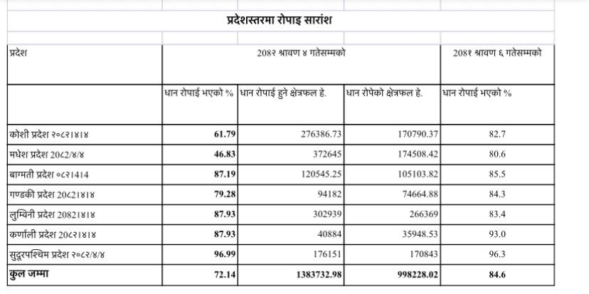 केन्द्रका अनुसार सबैभन्दा धेरै सुदूरपश्चिममा ९६.९९ प्रतिशत धान रोपाइँ भएको छ । यस प्रदेशमा १ लाख ७६ हजार १ सय ५१ हेक्टरमा रोपाइँ हुन्छ । यसमध्ये १ लाख ७० हजार ८ सय ४३ हेक्टर रोपाइँ भइसकेको छ । गत साउन ६ सम्म यस प्रदेशमा ९६.३ प्रतिशत रोपाइँ भएको थियो ।
