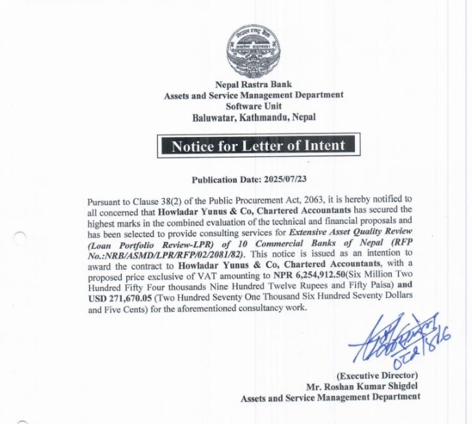 गत वर्ष पुसमा राष्ट्र बैंकले एक सूचनामार्फत इच्छुक विदेशी लेखापरीक्षकलाई नेपालका वाणिज्य बैंकहरुको व्यापक सम्पत्ति गुणस्तर समीक्षा (लोन पोर्टफोलियो रिभ्यू–एलपीआर) का लागि आशयपत्र बुझाउन आहृवान गरेको थियो । यसरी आशयपत्र बुझाउने विदेशी लेखापरीक्षकमध्ये राष्ट्र बैंकले बंगलादेशको हाउलदार युनुस कम्पनीलाई छानौट गरेको थियो ।