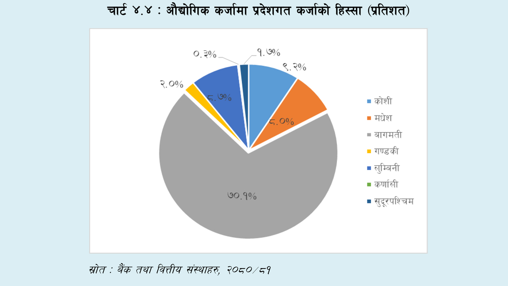 औद्योगिक कर्जामा कोशी प्रदेशमा प्रवाहित कर्जाको हिस्सा ९.२, मधेश प्रदेशको ८, बागमती प्रदेशको ७०.१, गण्डकी प्रदेशको २, लुम्बिनी प्रदेशको ८.७, कर्णाली प्रदेशको ०.३ र सुदूरपश्चिम प्रदेशको १.७ प्रतिशत छ ।