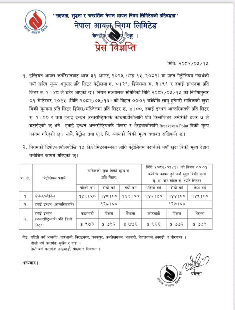 पेट्रोल र खाना पकाउने एलपी ग्यासको बिक्री मूल्य भने यथावत राखिएको निगमको विज्ञप्तिमा उल्लेख छ ।