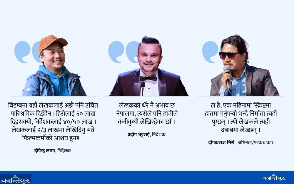 director Dipendra Lama says that due to the lack of writers, some screenwriters in the film industry are forced to write a lot of films in a short period of time. In addition, Lama told that there is no atmosphere to be excited about the writer who is writing because the investment to be made on the writer is also low. It takes an average of 6 months to write a