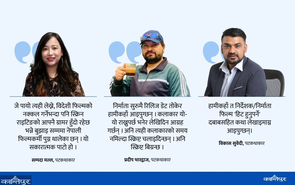 filmmaker Dipendra Lama argues that even though the filmmakers cannot trust the new screenwriters, the vacancy in this field is not filled. 'The producer, the director has not been able to find a new writer . which The film is being written, believe only in him . How many directors don't even have the ability to decide whether the script written by a new writer is good or not,' he said critically, 'they are likely to like the script that they have seen in many films and have the plot of a Hindi/English film . Therefore, there is an environment where many writers who write creatively are discouraged now.'