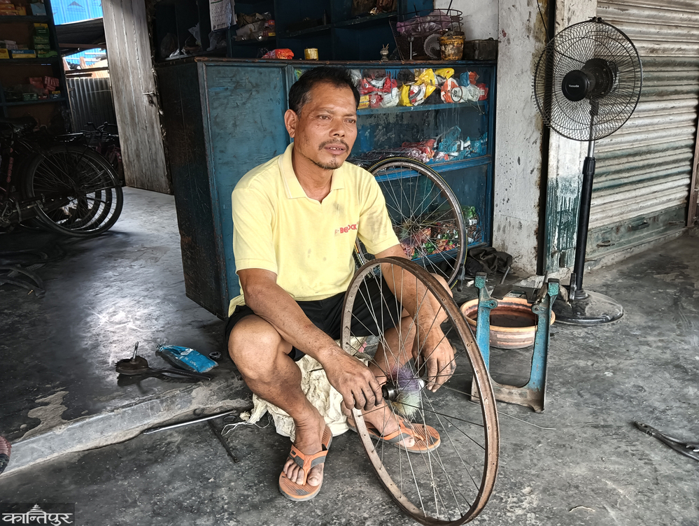 has been three decades. Kul Bahadur Rajwansi's journey of bicycle repair is going on and on and on. A city in the race to become a major commercial city has its bicycle repair center at Itabatta Chowk South. He has rented a shutter. Inside the shutters there are bicycle making accessories . Bicycles arriving for repairs outside the shutters . Which he is repairing and running daily.