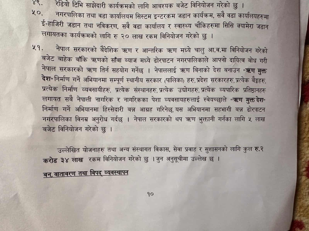 In the budget presented by Acting City Chief Dhan Bahadur Kayat, it is mentioned that 500,000 has been allocated for the campaign to make the country debt-free. Sherchan says that everyone should understand their responsibility and join hands in the campaign to make Nepal a debt-free country.