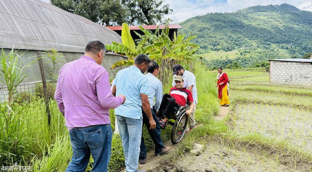 A bridge has been constructed along the road leading to the ward office from the side of Madhyapahari Lokmarg. There is a narrow gorge along the hill. On the right is a rice paddy field. On the left side, there is a farm of plastic tunnels and the enclosure of the land occupied by the farm. According to Prakash Chiluwal, President of Rural Handicapped Society Nepal Rainas, citizens with disabilities have a problem in taking public services.