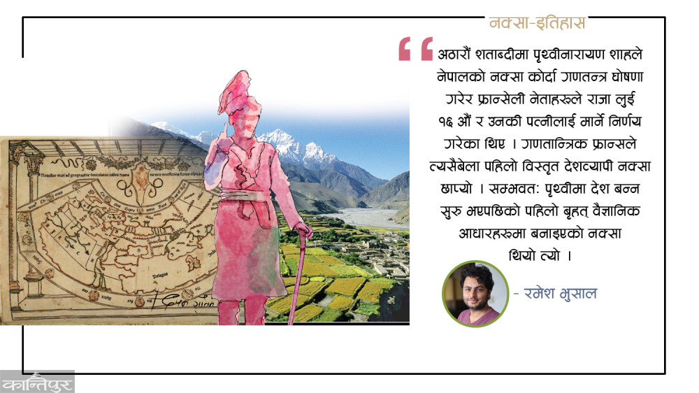 अठारौं शताब्दीको मध्यमा पृथ्वीनारायण शाहले नेपालको नक्सा कोर्दै गर्दा उता फ्रान्समा भने शक्तिशाली राजतन्त्र ओरालो झर्दै थियो । सन् १७९३ मा गणतन्त्र घोषणा गरेर फ्रान्सेली नेताहरूले राजा लुई १६ औं र उनकी पत्नीलाई मार्ने निर्णय गर्दै गर्दा यता भने शाहवंशको मियो भर्खर गाडिएको थियो । गणतन्त्र फ्रान्सले त्यसै वर्ष पहिलो विस्तृत देशव्यापी नक्सा छाप्यो । सम्भवतः यो पृथ्वीमा देश बन्न सुरु भएपछिको पहिलो बृहत् वैज्ञानिक आधारहरूमा बनाइएको नक्सा थियो त्यो । तर, गणतन्त्र घोषणँ गरेका फ्रान्सेलीहरूलाइ एउटा कुराले पिरोल्यो । खासमा फ्रान्सको नक्सा राज्यसँग होइन, जिन डोमिनिक कासिनी नामका व्यक्तिको स्वामित्वमा थियो । राजाका प्रिय पात्र कासिनीका जिजुबुबादेखि नक्साको काम सुरु भएर चार पुस्तापछि जिन कासिनीसम्म आइपुग्दा प्रान्सले सबैभन्दा आधुनिक नक्सा तयार गरेको थियो । लुई सोह्रौंको घाँटी काटेपछि राज्यले कासिनीको नक्सा पनि जफत गर्या र गणतन्त्रको झन्डा फहरायो । उचाइसहितको नक्सा बनाउने काम १८ औं शताब्दीमा द्रुत गतिमा भइरहेको थियो र फ्रान्स सम्पूर्ण देशको आधुनिक र वैज्ञानिक नक्सा बनाउने पहिलो राज्य बन्यो ।