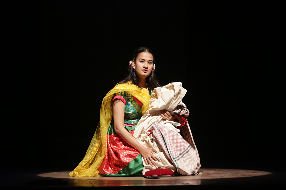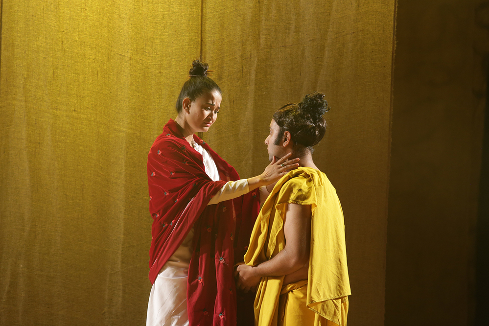 Yashodhara of 'Gachchami' is thankful - to land, indebted - to water, grateful - to air, blessed - to fire. Yashodhara's face is calm. The face is bright. With her hand on her chest, she keeps questioning the Buddha, looking down-up, forward-backward in a calm voice.